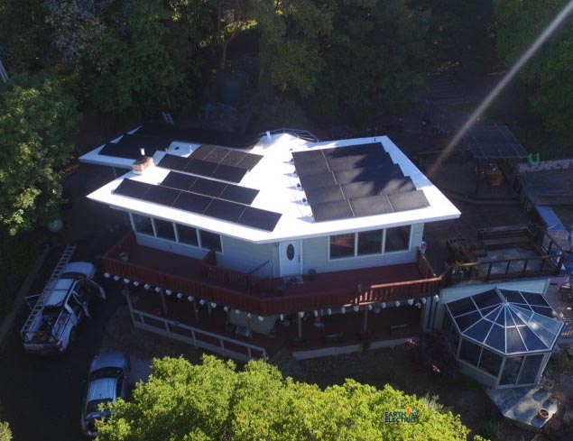 Earth Electric installed this 14.28kW roof mounted solar and storage system in the Los Gatos mountains to include 42 – 340W panels on the customer’s flat roof. The system also includes 2 – SolarEdge 6kW Energy Hub inverters and 2 – 16kWh LG Chem batteries to provide important backup, including their well pump for water during power outages.